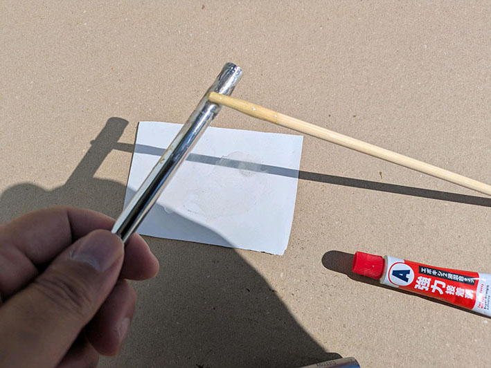 道具は、「丸形の割り箸」「ノギス」があればよいでしょう。「グラスビーズ」があれば尚良しです。シャフトと穴との隙間を埋めてくれるのでよいです。