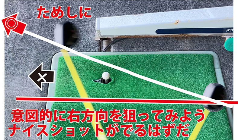 ためしに調子が悪くなったらアドレスは真っ直ぐのままで、右に20〜30度の方向に打ち出してみよう。強いナイスボールがでることが多い。